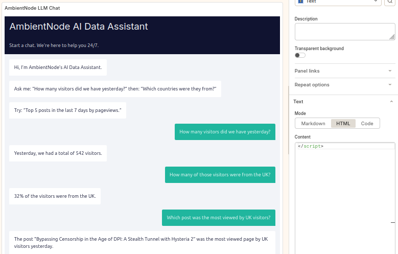 Now embed the n8n chat UI into Grafana. In your Grafana dashboard, add a new panel: