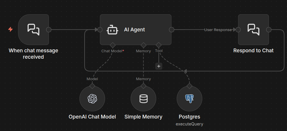 Next, add an AI Agent node. This is your controller, it takes the user's message, decides whether it needs to query the DB, writes SQL, calls the Postgres tool, then summarizes the results.