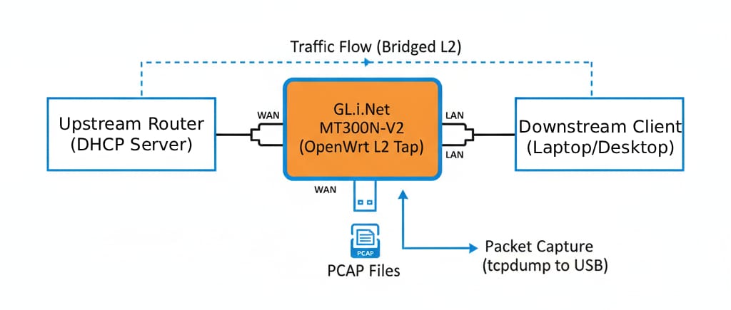 In this project, the same fundamental idea is implemented using a small OpenWrt device, the GL.iNet MT300N-V2 (Mango), configured as a transparent Layer-2 bridge with local packet capture.